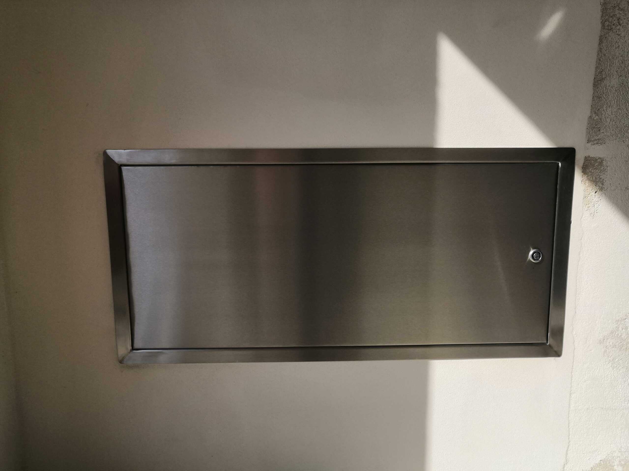 Naše nerezová revizní dvířka jsou ideálním řešením pro estetické a funkční zakrytí plynových hodin, elektroměrových rozvaděčů nebo jiných technických prvků. Vyrábíme je na míru přesně podle vašich požadavků, ať už pro instalaci do fasády domu nebo plotu.